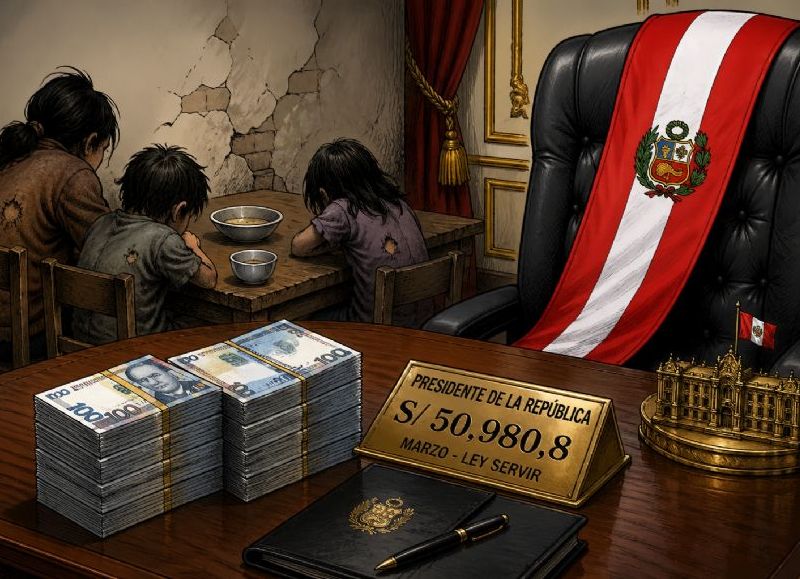 El mandatario interino, José Balcázar, percibió 50.980,8 soles en marzo bajo Ley Servir. La cifra contrasta con niveles de desaprobación que rozan el 49,6 por ciento. (Dibujo: ChatGPT-IA)